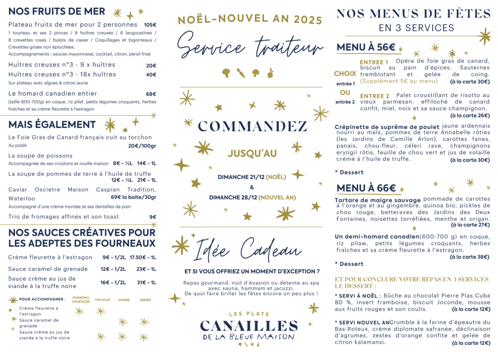 | Chers Canailles, En cette année 2025, notre maison poursuit avec passion l’art de la convivialité et le plaisir du partage, en venant une fois encore égayer vos tables de fête. Pour les 24, 25 et 31 décembre, notre service traiteur vous invite à découvrir deux menus Gourmands à emporter, accompagnés d’une sélection de plats raffinés à la carte. Vous retrouverez également nos grands classiques : plateaux de fruits de mer, foie gras, caviar, huîtres, sans oublier nos sauces canailles et bien d’autres délices pensés pour régaler vos convives… ou pour offrir un peu de gourmandise. Toute l’équipe des Plats Canailles de la Bleue Maison vous remercie sincèrement pour votre confiance et votre fidélité tout au long de l’année. Nous vous souhaitons d’ores et déjà une année 2026 pleine de bonheur, de saveurs et de moments partagés. Prenez soin de vous et à très bientôt, Martin, Brice, Anne, Richard et toute l’équipe des Plats Canailles |